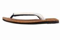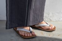 ブラウン色のパナマメッシュ天板に、白縦縞の小千谷縮を使用した花緒を合わせた、爽やかで引き締まった雰囲気の雪駄です。