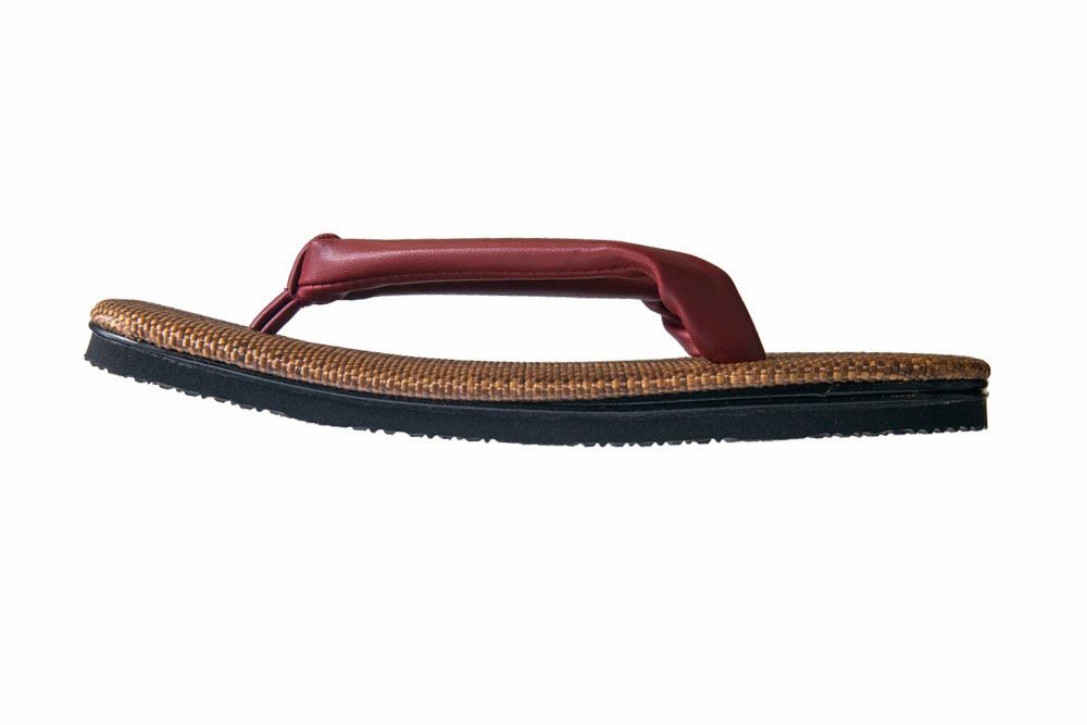 奈良月ヶ瀬のお茶で染め上げた布を使用した雪駄 【訳あり】雪駄 -Re:休- 奈良大和茶染め 小千谷縮(赤白縞) のぞき花緒【メンズ】|R2031Z