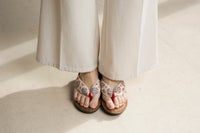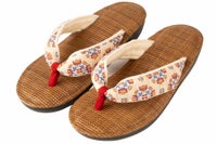 日本古来より伝わり愛されてきた唐花紋をモチーフに使用したカラフルな麻素材の花緒に、パナマ織の天板を合わせた軽やかな印象を与える雪駄です。