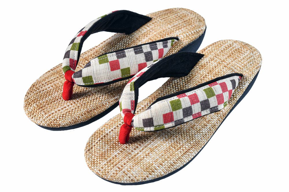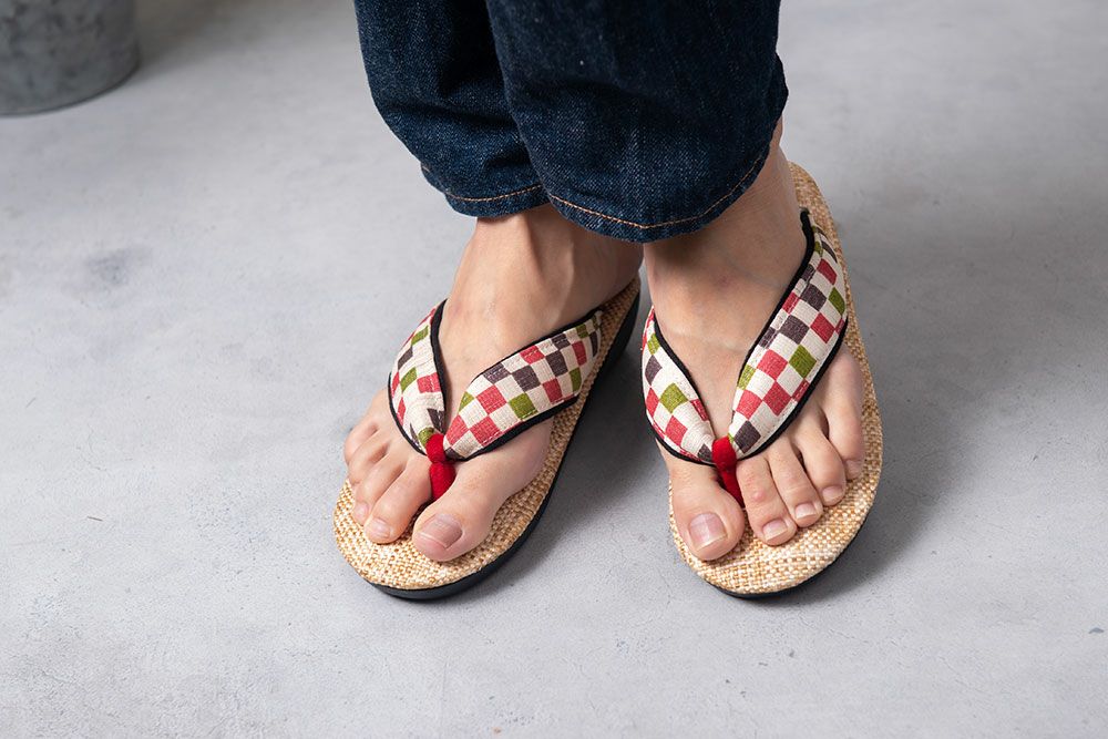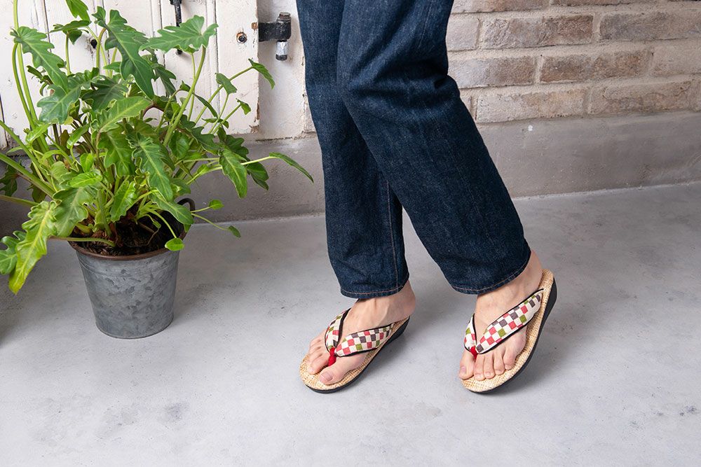 石畳をモチーフにしたカラフルな麻素材の花緒に、パナマ織の天板を合わせた軽やかな印象を与える雪駄です。