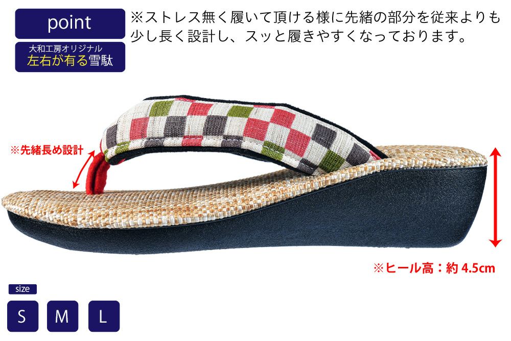ヒールの高さのあるウェッジタイプの雪駄で、ソール部分は大和工房オリジナルのこだわりが詰まっています。