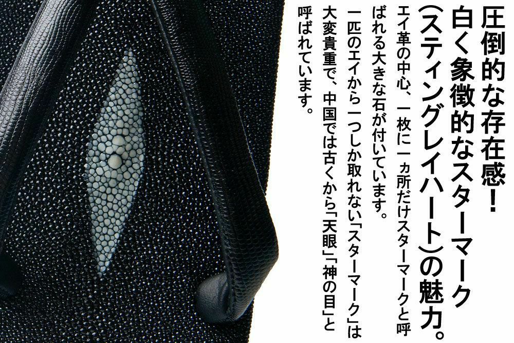 ※天板に使用しております「エイ革」の特徴である、白い斑点の「スティングレーハート」と呼ばれる部分につきまして、左右の位置にずれが生じている場合がございますが、天然素材を使用しておりますため、不良とはみなしておりません。予めご了承頂けますようお願い致します。