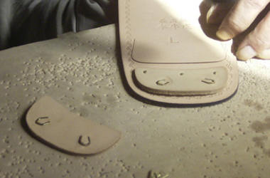 雪駄の特徴である踵裏革の取り付けについてご紹介します。