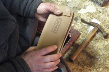 2.接着剤を付け裏革に固定する