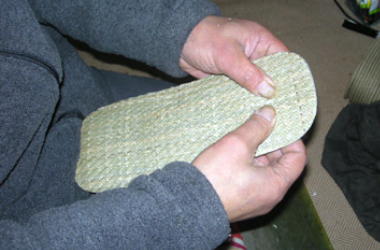 雪駄の特徴である踵裏革の取り付けについてご紹介します。